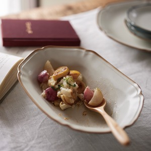 マットホワイトにブラウンの縁取りがアクセントのカレー皿。すくい易く工夫されたwoodスプーン付。パスタやサラダにも程良い深さが嬉しいです。
