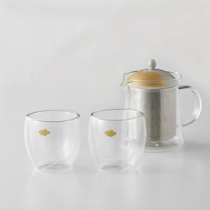耐熱のダブルウォール(二重構造)グラスと、洗いやすい有能茶こしが嬉しいガラスポット。ポット蓋とグラス部分にあるワンポイント金雲(KINKUMO)で運気も気分もアップします。
