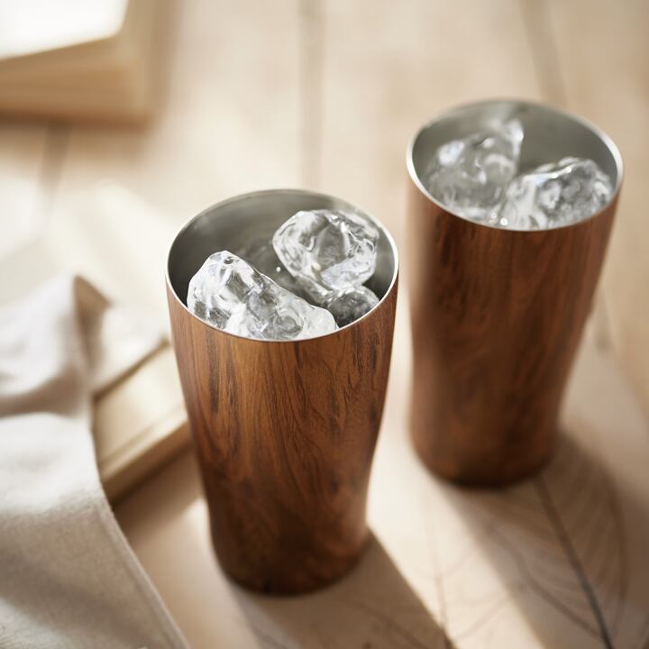 あらゆるシーンに便利な保温保冷の二重構造ステンレスカップ。オシャレなwood調柄は野外にも映えますので野外パーティーやキャンプにも◎
