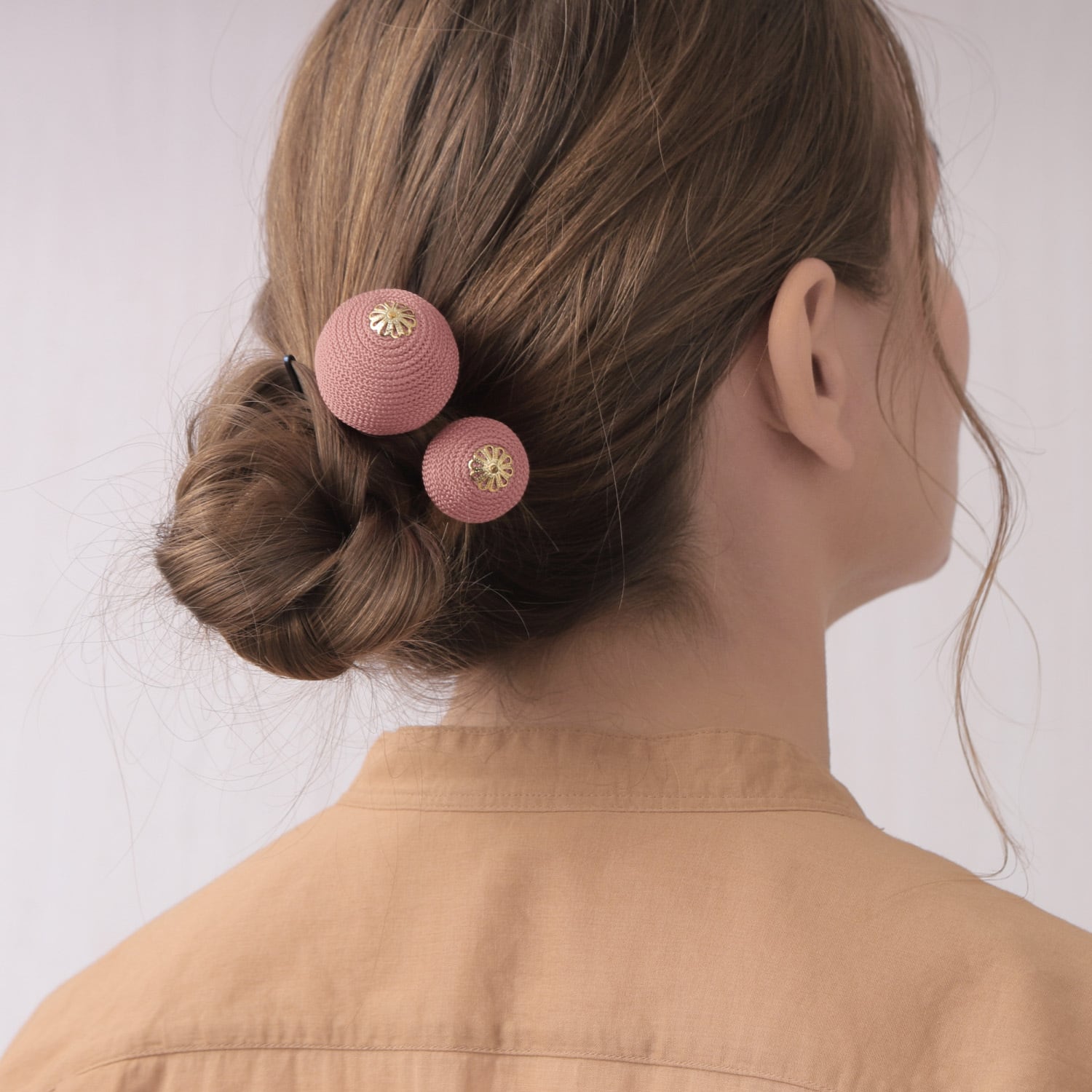 表面の凹凸感を楽しめる「江戸打ち紐」を巻き付けた大小の糸玉が、リズム感のあるヘアスタイルを演出します。