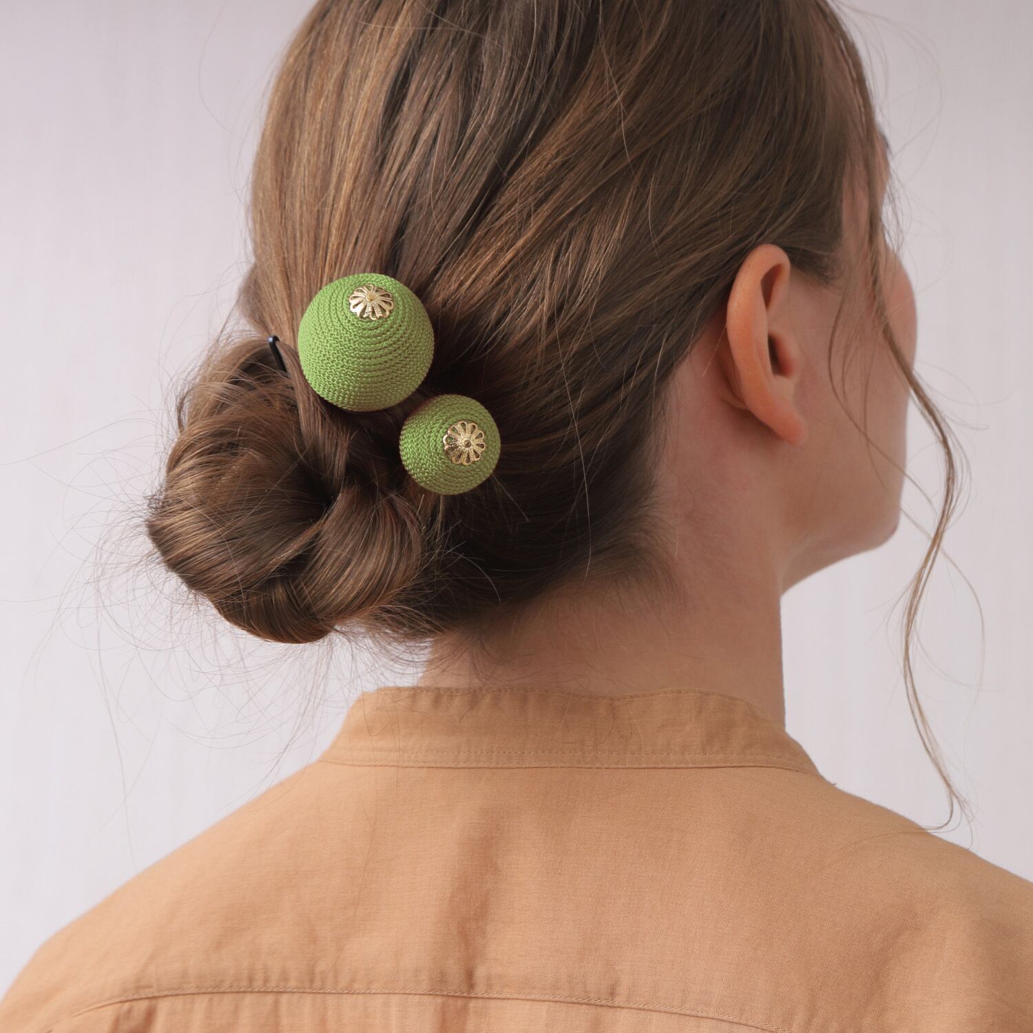 表面の凹凸感を楽しめる「江戸打ち紐」を巻き付けた大小の糸玉が、リズム感のあるヘアスタイルを演出します。