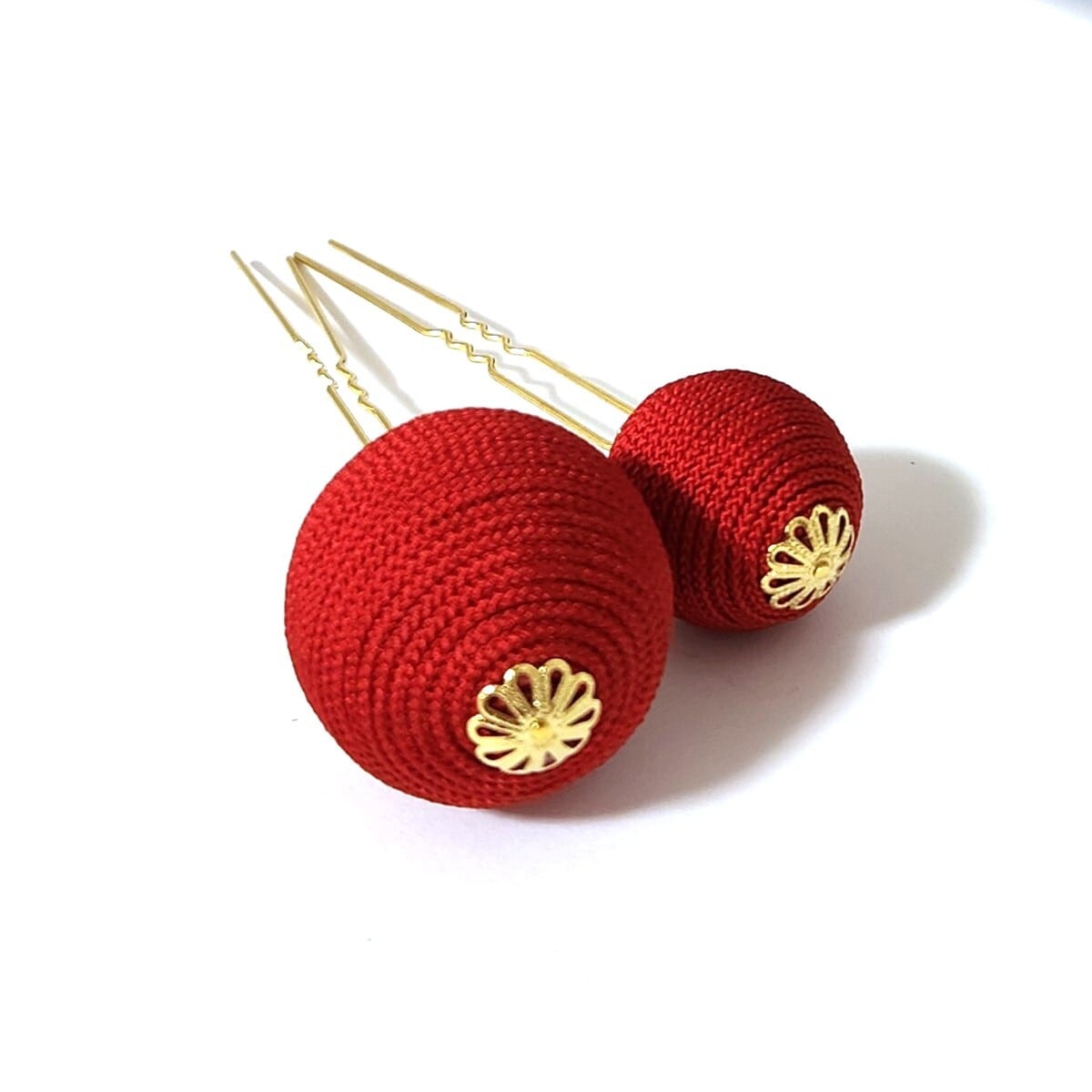※セット内容は単色の糸巻玉が大小1個ずつと付属のかんざし2本です。カラーは1枚目の商品画像を参照してください。複数カラーの商品画像はイメージです。