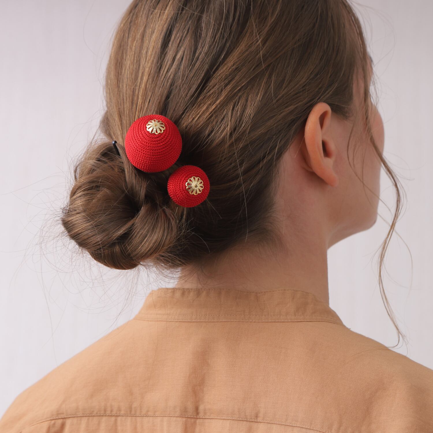表面の凹凸感を楽しめる「江戸打ち紐」を巻き付けた大小の糸玉が、リズム感のあるヘアスタイルを演出します。
